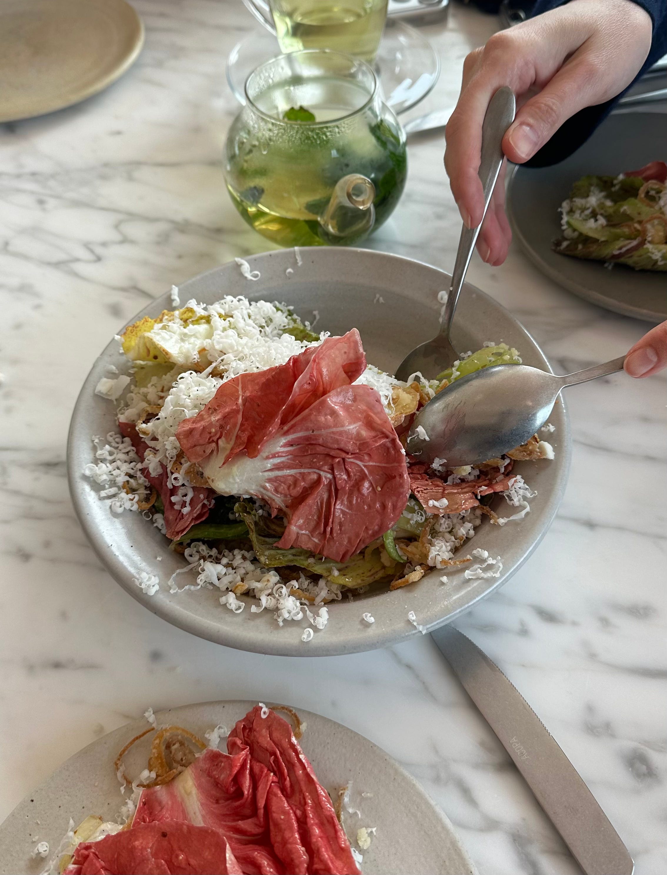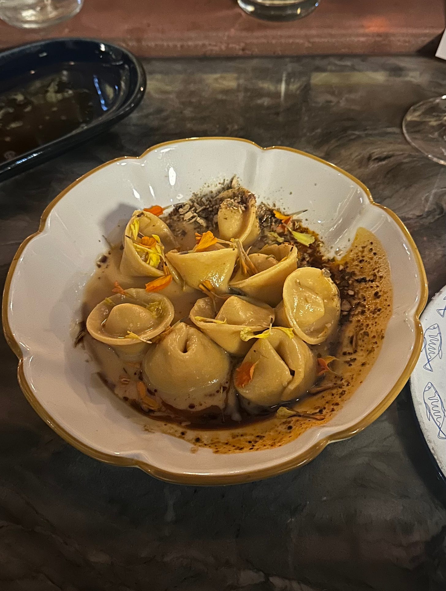 The room is gorgeous. And thank god, has some COLOR. The red floors are fun. The little fish-decor details peppered around will make you smile as you notice them. I would’ve taken more photos if I wasn’t so giddy about the company at my table and the warm welcome. But there are plenty of great pics online ofc.