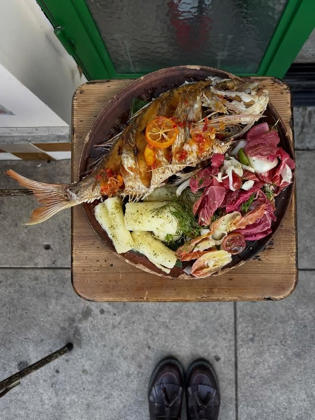 Pescadito Frito at Chainsaw: Whole fried snapper, mandarinquat & 🌶️ vin, rosalba endaladita, yuca boiled and dressed with good olive oil and loads of green pepper corn. WOW